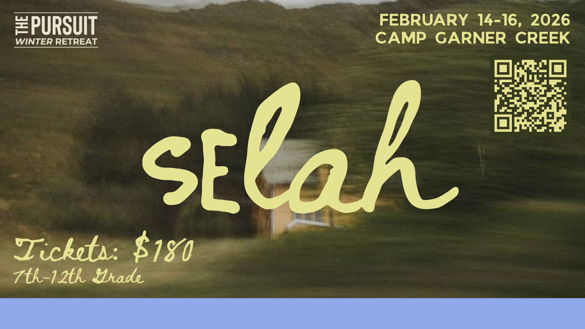 Gather with 7th-12th grade students from all over Nashville for a weekend you won't forget. February 14-16 at Camp Garner Creek in Dickson, TN, we'll seek God together and discover what He has for us in the year ahead. Through worship, real conversations, and time to just pause and listen, you'll experience the heart of this year's theme: "Selah." Come ready to connect, grow, and hear from God!